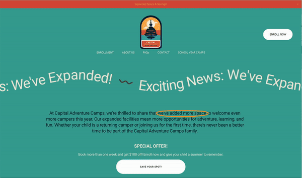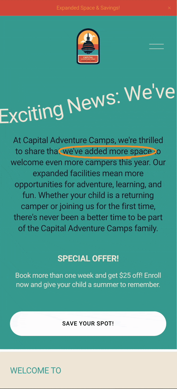 The website's design reflects the camp's branding, using the same color palette, typography, and logo. This consistency reinforces the camp's identity and ensures a cohesive experience across all touchpoints.